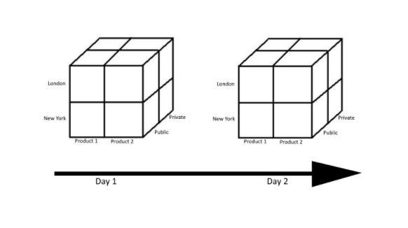 The third dimension we incorporated into our data is “Customer Type” which tells us whether our customer was public or private.We can then add a fourth dimension to our data, which in this example is time. This allows us to keep track of our sales, giving us the ability to see how each product is selling in relation to each store location, customer type, and time.