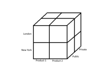 A multidimensional database is another type of database that is optimized for online analytical processing (OLAP) applications and data warehouses. It is not uncommon to use a relational database to create a multidimensional database.As the name suggests, multidimensional databases contain arrays of 3 or more dimensions. In a two dimensional database you have rows and columns, represented by X and Y. In a multidimensional database, you have X, Y, Z, etc. depending on the number of dimensions in your data. Below is an example of a 3-Dimensional Data Array represented in a relational table and in 3-D.ItemStore LocationCustomer TypeQuantityProduct 1New YorkPublic47Product 2New YorkPrivate20Product 1LondonPublic36Product 2LondonPublic69Product 1New YorkPrivate36Product 2New YorkPublic48Product 1LondonPrivate40Product 2LondonPrivate28